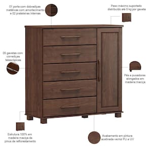 Cor: Café | Altura: 124 cm | Largura: 125 cm | Quantidade de gavetas: 5 | Requer montagem: Sim | Linha: Quarto | Profundidade: 49 cm | Peso: 53 kg | Com alça: Sim | Com corrediças: Sim | Material das corrediças: Metálico | Com prateleiras: Não | Com rodas: Não | É personalizado: Não | Com bandeja removível: Não | Inclui ferramentas de montagem: Não | Material do cabo: Madeira | Material das dobradiças: Metálicas