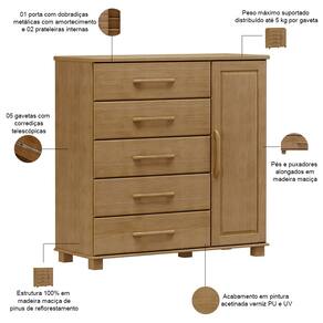 Com 5 gavetas espaçosas e 1 porta com prateleiras internas, essa cômoda para quarto transforma o armazenamento em uma experiência premium. Cada detalhe foi pensado para quem exige perfeição, desde as gavetas com profundidade ideal para as mais diversas roupas até a porta com prateleiras, onde cada sapato tem seu lugar ao sol. Para finalizar, a estrutura 100% em madeira maciça une resistência e beleza em proporções exatas.