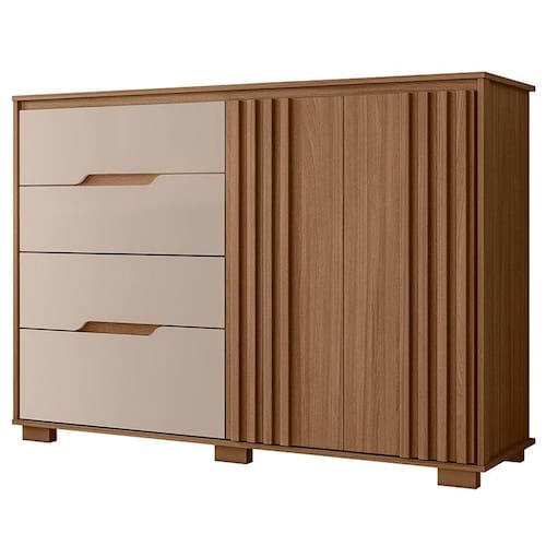 Começou a procurar móveis para seu quarto? Então apresentamos para você esta bela cômoda da linha Texas. Composta por duas portas com detalhes ripados adicionam um toque de requinte. Contando com quatro gavetas espaçosas equipadas com corrediças telescópicas, garante um deslizamento mais suave e seguro. Para completar, os pés em PVC garantem mais estabilidade e facilita na limpeza. Fabricado pela Moval, é desenvolvido em 100% MDP, sendo a escolha perfeita para quem deseja sofisticação e praticidade na organização quarto, aproveite!