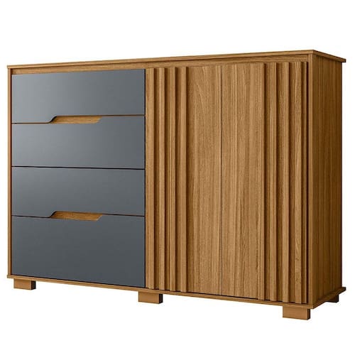 Começou a procurar móveis para seu quarto? Então apresentamos para você esta bela cômoda da linha Texas. Composta por duas portas com detalhes ripados adicionam um toque de requinte. Contando com quatro gavetas espaçosas equipadas com corrediças telescópicas, garante um deslizamento mais suave e seguro. Para completar, os pés em PVC garantem mais estabilidade e facilita na limpeza. Fabricado pela Moval, é desenvolvido em 100% MDP, sendo a escolha perfeita para quem deseja sofisticação e praticidade na organização quarto, aproveite!