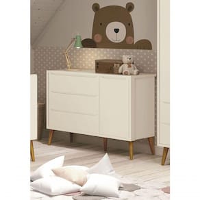 Contemplando um ar retrô com seus pés em madeira maciça no estilo palito, a Cômoda Sapateira Theo New - RELLER possui um desing clean que combina com vários estilos de decoração. É ideal para a organização das roupinhas e acessórios do seu bebê, proporciona um super espaço para armazenamento e com divisória interna, para que a organização do dia-a-dia possa ser mais fácil. Possui puxadores, no modelo embutido, as aberturas ocorrem através de recortes no MDF que possibilitam o perfeito encaixe da mão para que possa abrir as portas e gavetas.