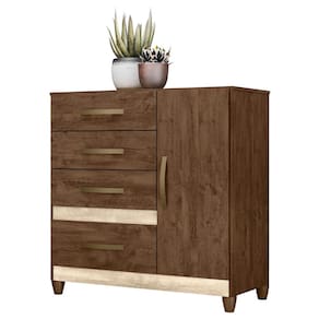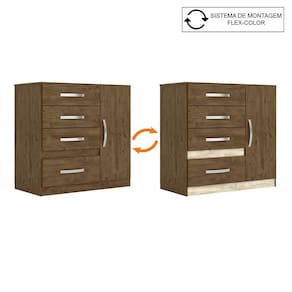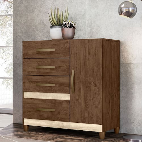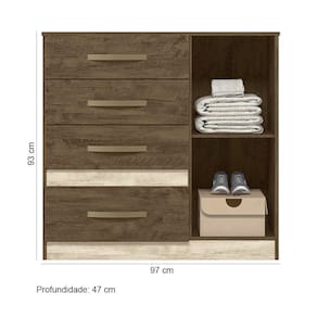 Características Estrutura em MDP de 15mm. Pintura em acabamento UV. 01 Porta articulada com dobradiças metálicas. 04 Gavetas externas com corrediças metálicas. Puxadores na cor bronze. Prateleira interna com amplo espaço.
