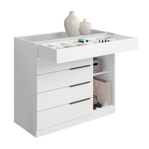 Produzida em MDP resistente com tampo de vidro elegante, conta com 5 gavetas espaçosas de corrediças telescópicas, sendo uma com divisória móvel, além de 1 porta para ampliar a organização.