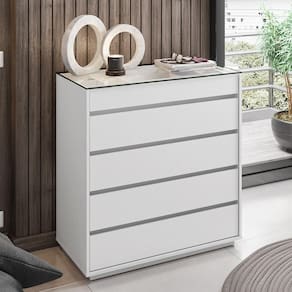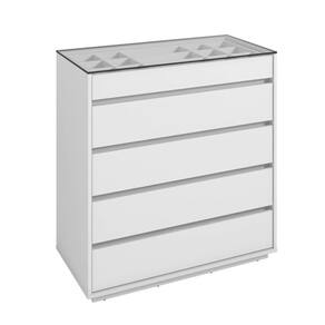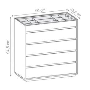 Ela possui 5 gavetas sendo que a superior possui um organizador interno para joias, relógios, etc, feito em MDF.