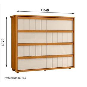 Diferenciais do produto: Acabamento padrão Madetec 100% MDF, Moldura envoltória de 25mm, Gavetas com ripado angular, 8 Gavetas com corrediças telescópicas, Puxadores em MDF estilo cava, Moldura envoltória e tampo de 25mm, Largura de 1,36m.