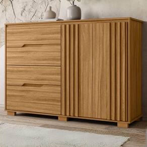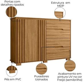 Cômoda Texas alia funcionalidade e design moderno para organizar seu ambiente com estilo. Estrutura em MDP (gavetas e tampo 15 mm / base e fundo 12 mm) com acabamento em pintura UV. Composta por 4 gavetas (sendo 1 gavetão) equipadas com corrediças metálicas, portas com detalhes ripado (baixo relevo) equipadas com dobradiças (35mm) com amortecedor, puxadores em cava e pés em PVC. Este produto será entregue em 02 volumes.
