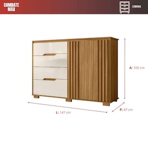 A Comoda Texas da Moval e a escolha ideal para quem busca funcionalidade, design moderno e excelente aproveitamento de espaco. Com 4 gavetas, 2 portas e prateleira interna, ela oferece ampla capacidade de armazenamento para roupas, acessorios, documentos ou itens diversos.