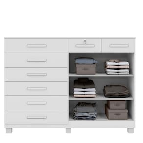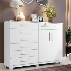 A Cômoda Triunfo une funcionalidade e sofisticação com seu design moderno e acabamento fosco melamínico BP. Possui 8 gavetas espaçosas, sendo 1 com chave, 2 portas com prateleiras internas que funcionam como sapateira, corrediças telescópicas, puxadores madeirados e pés em PVD. Com tampo de 15 mm e estrutura em MDP, oferece resistência e amplo espaço em um móvel de 135,5 cm, Ideal para organizar seu quarto com estilo e praticidade