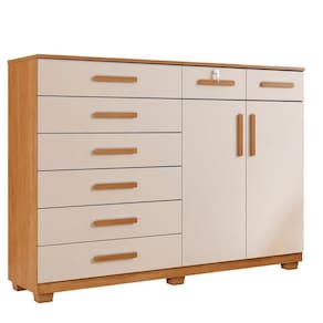 A Cômoda Triunfo une funcionalidade e sofisticação com seu design moderno e acabamento fosco melamínico BP. Possui 8 gavetas espaçosas, sendo 1 com chave, 2 portas com prateleiras internas que funcionam como sapateira, corrediças telescópicas, puxadores madeirados e pés em PVD. Com tampo de 15 mm e estrutura em MDP, oferece resistência e amplo espaço em um móvel de 135,5 cm, Ideal para organizar seu quarto com estilo e praticidade