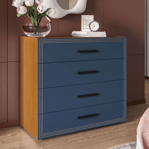O(a) Cômoda Valência 4 Gavetas Freijó/Azul - Politorno é produzido em MDF e MDP na escala de brilho Semi-Fosco, e possui um grau de dificuldade de montagem: Médio.