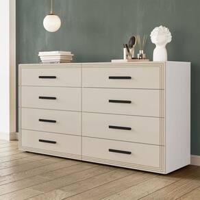 O(a) Cômoda Valência 8 Gavetas Branco/Creme - Politorno é produzido em MDF e MDP na escala de brilho Semi-Fosco, e possui um grau de dificuldade de montagem: Médio.