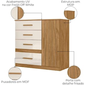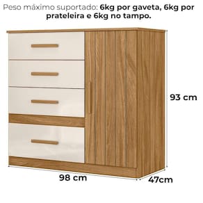 A Cômoda Vênus combina praticidade e design moderno. Estrutura em MDP (porta e tampo 15 mm/ base e fundo 12 mm) com acabamento em pintura UV. Composta por 4 gavetas (sendo 1 gavetão) equipadas com corrediças metálicas, 1 porta equipada com dobradiças metálicas, 1 prateleira interna (ajustavel ou removível), puxadores em MDF e sapatas niveladoras. Este produto será entregue em 01 volume.