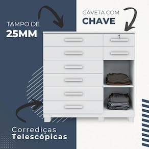 A Cômoda Vitória completa seu quarto com muito charme e beleza, possui 8 gavetas muito espaçosa sendo 1 com chave, com corrediças telescópica que dá muita suavidade e resistência, ainda possui 1 porta e tem 1 prateleira interna que constitui uma sapateira bem definida, além de possuir tampo de 25 mm que garante uma vida útil muito maior e muita resistência.