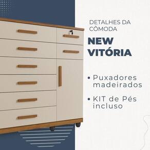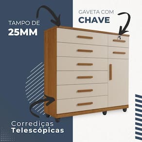 A Cômoda Vitória completa seu quarto com muito charme e beleza, possui 8 gavetas muito espaçosa sendo 1 com chave, com corrediças telescópica que dá muita suavidade e resistência, ainda possui 1 porta e tem 1 prateleira interna que constitui uma sapateira bem definida, além de possuir tampo de 25 mm que garante uma vida útil muito maior e muita resistência.