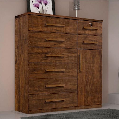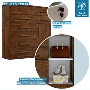 Caracteristicas: Tipo Pintura: Ambiente Principal: Quarto Material Principal: MDP Possui Portas: 1 Possui Prateleira: 1 Possui Gavetas: 8 Tipo Corredica: Telescopica Possui Chave e Tranca: 1 Tipo Portas: Bater Tipo Puxador: Madeirado Complexidade Da Montagem: Medio Sistema De Montagem: Parafusos e Cavilha Possui Pes: Nao Rodizio Com Trava: Nao Possui Altura Dos Pes: Nao Possui Material Dos Pes: Pvc Espelho: Nao Cabideiro: Nao