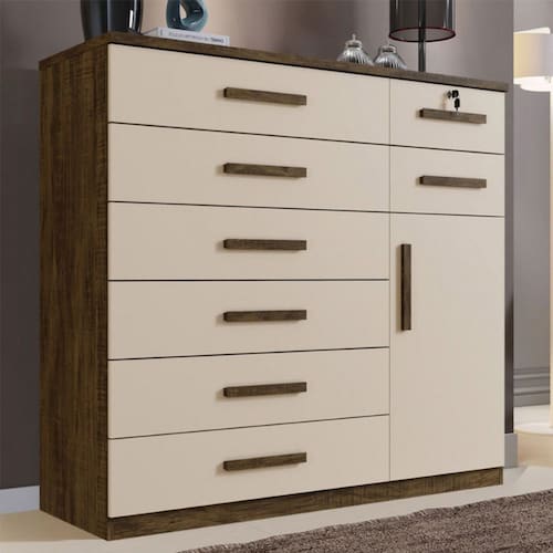 Características: Tipo Pintura: U.V. Ambiente Principal: Quarto Material Principal: MDP Possui Portas: 1 Possui Prateleira: 1 Possui Gavetas: 8 Tipo Corrediça: Telescópica Possui Chave e Tranca: 1 Tipo Portas: Bater Tipo Puxador: Madeirado Complexidade Da Montagem: Médio Sistema De Montagem: Parafusos e Cavilha Possui Pés: Não Rodízio Com Trava: Não Possui Altura Dos Pés: Não Possui Material Dos Pés: Pvc Espelho: Não Cabideiro: Não