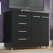 • A cômoda também é um móvel que pode servir como suporte para TV e apoio para objetos de decoração como porta-retrato, luminária e abajur, por exemplo.