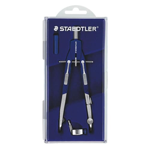 -compasso de precisão com roda central -corpo de metal e plástico resistente -botão de ajuste rápido de fricção -possui agulha permutável -adaptador universal -círculo máximo aproximado: Ø350 mm -comprimento 170 mm -estojo com tampa articulada -referência: 552
