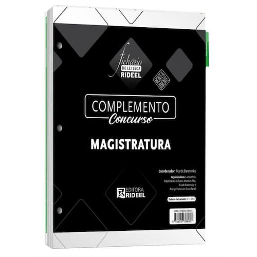 Dentre as virtudes do Fichário de Lei Seca, a possibilidade de ter uma legislação personalizada e transportável se destaca. Mais ainda, o Fichário propicia a oportunidade de você confeccionar uma coletânea de leis específicas para se preparar para a carreira que pretende seguir; evitando, pois, alguma lacuna normativa.Pensando nisso, a Rideel e os Organizadores lançaram este Complemento de leis para o Concurso da MAGISTRATURA – que permite que você tenha em mãos um material mais específico possível para seu estudo. Em suma, além das leis gerais do Fichário de Lei Seca, agora você poderá ter as leis pertinentes à Carreira desejada. Especificidade, praticidade e integridade, estes são os benefícios trazidos por este complemento de leis. Marca: RIDEEL EDITORA **