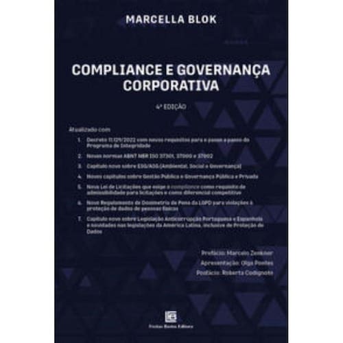 A constatação de que a obra é um sucesso de público e de crítica é extraída do fato de que ela já foi publicada em quatro edições, algo raro no mercado editorial jurídico. Desde a sua primeira edição, foi ela edificada a partir de ótimo acervo bibliográfico e de sólidos conceitos técnicos, trazendo um texto que, em momento algum, deixa de estabelecer a perfeita associação entre a teoria e prática, o que é fundamental para o profissional que assume a missão de implementar um efetivo programa de integridade... Um dos grandes méritos deste livro, sem dúvida nenhuma, é sua absoluta atualização, tratando, inclusive, de aspectos do Decreto nº 11.129, de 11 de julho de 2022, o qual regulamenta a Lei nº 12.846, de 1º de agosto de 2013, a conhecida Lei Anticorrupção Empresarial . Muitas dessas inovações, aliás, são absolutamente aderentes às recomendações do Conselho da OCDE Organização para a Cooperação e Desenvolvimento Econômico, o que demonstra um alinhamento pleno entre a legislação brasileira e as melhores práticas internacionais. ... Como demonstrar de maneira clara, efetiva e segura que a organização se preocupa não apenas com aspectos formais de um programa de compliance clássico, mas, principalmente com a disseminação e a absorção da cultura de integridade no ambiente corporativo? A resposta para essa pergunta encontra-se bastante detalhada na obra e, sem qualquer dúvida, a contribuição trazida pela autora será de grande utilidade para as organizações que pretendam aperfeiçoar os seus sistemas... Marcelo Zenkner (prefácio da obra) Recomendo com entusiasmo a leitura dessa quarta edição do livro Compliance e Governança Corporativa da jovem, inspiradora e brilhante jurista, Marcella Blok (que tem nos brindado com excelentes e úteis estudos jurídicos servindo como referência aos temas ligados aos programas de integridade e de Compliance, governança e riscos, ademais de questões ligadas à agenda ESG Ambiental, Social e Governança , ética, gestão pública e privacidade de dados, cuja terceira edição foi eleita a melhor sobre o tema de Governança Corporativa ) aos especialistas, estudantes, profissionais como advogados, administradores, contadores, administradores, contadores, profissionais de tecnologia e tantos outros interessados no tema Compliance. (Nelson Eizirik, apresentação da obra)