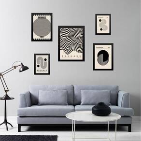 Composição 5 quadros bauhaus preto e branco Moldura: madeira preta Informações do produto tire todas as suas dúvidas no descritivo abaixo: decoração para quarto, sala, cozinha, escritório, área gourmet e muito mais. Chega de paredes vazias medidas - kit composto por 5 quadros, sendo 2 quadros com medida 18x24cm, 2 quadros com 24x33cm e 1 quadro com medida 33x45cm. Material do papel - papel fotográfico brilhante de altíssima resolução acabamento - todos os quadros são acompanhados de uma película de acetato para proteção da imagem. - os quadros são embalados de forma segura com plástico bolha com camada dupla de acordo com o tamanho dos quadros. Garantia - garantia de 3 meses. Meu quadro chegou. Como posso fixá-lo Você precisa apenas de um martelo e um prego, pois os quadros já vão acompanhados de penduradores. Esta é a forma mais indicada. Caso prefira, você pode utilizar uma fita dupla face neste caso, sugerimos de alta qualidade para evitar que descole e seu quadro caia . Como posso limpar meu quadro A limpeza é feita como um móvel comum da sua casa. Apenas um pano seco ou espanador são suficientes para tal