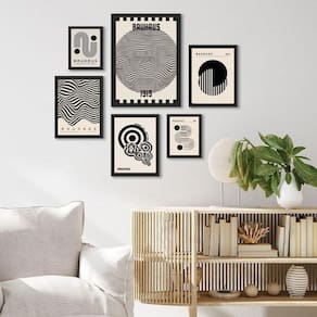 Composição 6 quadros bauhaus preto e branco Moldura: madeira preta Informações do produto tire todas as suas dúvidas no descritivo abaixo: decoração para quarto, sala, cozinha, escritório, área gourmet e muito mais. Chega de paredes vazias medidas - kit composto por 6 quadros, sendo 2 quadros com medida 18x24cm, 3 quadros com 24x33cm e 1 quadro com medida 33x45cm. Material do papel - papel fotográfico brilhante de altíssima resolução acabamento - todos os quadros são acompanhados de uma película de acetato para proteção da imagem. - os quadros são embalados de forma segura com plástico bolha com camada dupla de acordo com o tamanho dos quadros. Garantia - garantia de 3 meses. Meu quadro chegou. Como posso fixá-lo Você precisa apenas de um martelo e um prego, pois os quadros já vão acompanhados de penduradores. Esta é a forma mais indicada. Caso prefira, você pode utilizar uma fita dupla face neste caso, sugerimos de alta qualidade para evitar que descole e seu quadro caia . Como posso limpar meu quadro A limpeza é feita como um móvel comum da sua casa. Apenas um pano seco ou espanador são suficientes para tal