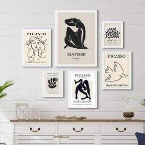 Composição 6 quadros cinza preto - matisse picasso Moldura: madeira preta Informações do produto tire todas as suas dúvidas no descritivo abaixo: decoração para quarto, sala, cozinha, escritório, área gourmet e muito mais. Chega de paredes vazias medidas - kit composto por 6 quadros, sendo 2 quadros com medida 18x24cm, 3 quadros com 24x33cm e 1 quadro com medida 33x45cm. Material do papel - papel fotográfico brilhante de altíssima resolução acabamento - todos os quadros são acompanhados de uma película de acetato para proteção da imagem. - os quadros são embalados de forma segura com plástico bolha com camada dupla de acordo com o tamanho dos quadros. Garantia - garantia de 3 meses. Meu quadro chegou. Como posso fixá-lo Você precisa apenas de um martelo e um prego, pois os quadros já vão acompanhados de penduradores. Esta é a forma mais indicada. Caso prefira, você pode utilizar uma fita dupla face neste caso, sugerimos de alta qualidade para evitar que descole e seu quadro caia . Como posso limpar meu quadro A limpeza é feita como um móvel comum da sua casa. Apenas um pano seco ou espanador são suficientes para tal