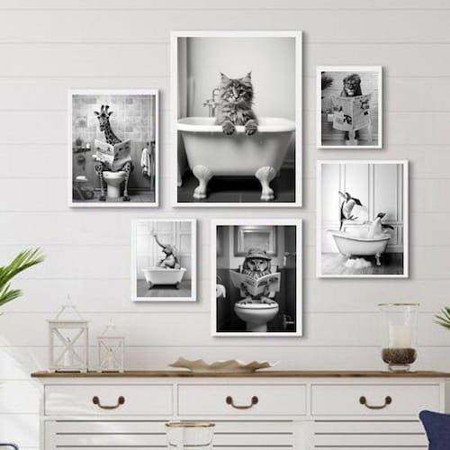 Composição 6 quadros divertidos banheiro- animais Moldura: madeira preta Informações do produto tire todas as suas dúvidas no descritivo abaixo: decoração para quarto, sala, cozinha, escritório, área gourmet e muito mais. Chega de paredes vazias medidas - kit composto por 6 quadros, sendo 2 quadros com medida 18x24cm, 3 quadros com 24x33cm e 1 quadro com medida 33x45cm. Material do papel - papel fotográfico brilhante de altíssima resolução acabamento - todos os quadros são acompanhados de uma película de acetato para proteção da imagem. - os quadros são embalados de forma segura com plástico bolha com camada dupla de acordo com o tamanho dos quadros. Garantia - garantia de 3 meses. Meu quadro chegou. Como posso fixá-lo Você precisa apenas de um martelo e um prego, pois os quadros já vão acompanhados de penduradores. Esta é a forma mais indicada. Caso prefira, você pode utilizar uma fita dupla face neste caso, sugerimos de alta qualidade para evitar que descole e seu quadro caia . Como posso limpar meu quadro A limpeza é feita como um móvel comum da sua casa. Apenas um pano seco ou espanador são suficientes para tal