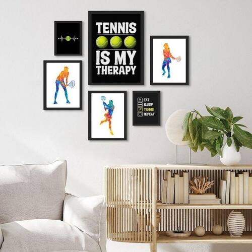 Composição 6 quadros jogadoras de tênis frases Moldura: madeira preta Informações do produto tire todas as suas dúvidas no descritivo abaixo: decoração para quarto, sala, cozinha, escritório, área gourmet e muito mais. Chega de paredes vazias medidas - kit composto por 6 quadros, sendo 2 quadros com medida 18x24cm, 3 quadros com 24x33cm e 1 quadro com medida 33x45cm. Material do papel - papel fotográfico brilhante de altíssima resolução acabamento - todos os quadros são acompanhados de uma película de acetato para proteção da imagem. - os quadros são embalados de forma segura com plástico bolha com camada dupla de acordo com o tamanho dos quadros. Garantia - garantia de 3 meses. Meu quadro chegou. Como posso fixá-lo Você precisa apenas de um martelo e um prego, pois os quadros já vão acompanhados de penduradores. Esta é a forma mais indicada. Caso prefira, você pode utilizar uma fita dupla face neste caso, sugerimos de alta qualidade para evitar que descole e seu quadro caia . Como posso limpar meu quadro A limpeza é feita como um móvel comum da sua casa. Apenas um pano seco ou espanador são suficientes para tal