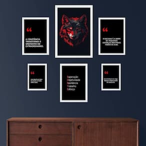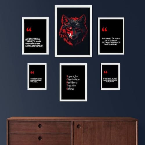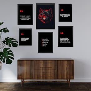 Composição 6 quadros motivacionais sucesso - lobo Cor: moldura branca Informações do produto tire todas as suas dúvidas no descritivo abaixo: decoração para quarto, sala, cozinha, escritório, área gourmet e muito mais. Chega de paredes vazias medidas - kit composto por 6 quadros, sendo 2 quadros com medida 18x24cm, 3 quadros com 24x33cm e 1 quadro com medida 33x45cm. Material do papel - papel fotográfico brilhante de altíssima resolução acabamento - todos os quadros são acompanhados de uma película de acetato para proteção da imagem. - os quadros são embalados de forma segura com plástico bolha com camada dupla de acordo com o tamanho dos quadros. - de 3 meses. Meu quadro chegou. Como posso fixá-lo Você precisa apenas de um martelo e um prego, pois os quadros já vão acompanhados de penduradores. Esta é a forma mais indicada. Caso prefira, você pode utilizar uma fita dupla face neste caso, sugerimos de alta qualidade para evitar que descole e seu quadro caia . Como posso limpar meu quadro A limpeza é feita como um móvel comum da sua casa. Apenas um pano seco ou espanador são suficientes para tal Marca: Não Informado