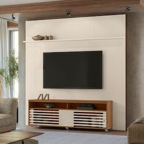 Características: Estrutura em MDP Pintura semi brilho Painel em MDF frisado (baixo relevo) Portas deslizantes frisadas Rodízios de Silicone Espaço para TV até 75 Polegadas.