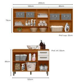 Dimensões do produto montado (armário superior e inferior): Altura: sup 79 cm - inf 89 cm Largura: sup 200 cm - inf 120 cm Profundidade: sup 32 cm - inf 50 cm Peso: 91,8 kg