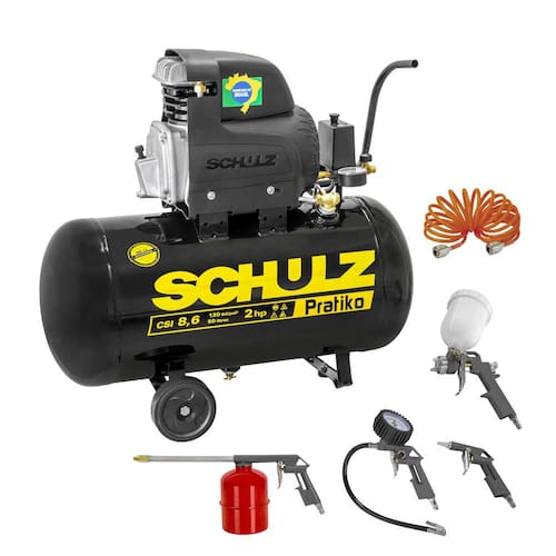 Potência e praticidade para o seu dia a dia! O Compressor Pratiko CSI 8,6/50 da Schulz é a escolha ideal para oficinas, pequenas indústrias e uso hobby/profissional leve, oferecendo ótimo desempenho e fácil transporte com rodas e suporte para enrolar o cabo. Com tanque de 50?L, produz ar comprimido entre 80 e 120 PSI, atendendo demandas como calibragem de pneus, limpeza, pequenas pinturas e acionamento de ferramentas pneumáticas, sem a necessidade de energia elétrica dedicada. Com motor de 2?HP e construção nacional, oferece operação confiável e manutenção acessível. Acompanha o Kit Acessório 5 Peças Schulz, com gatilhos para pintura, limpeza e pulverização, calibrador de pneus com manômetro e mangueira espiral — tudo o que você precisa para trabalhar com eficiência, praticidade e organização.