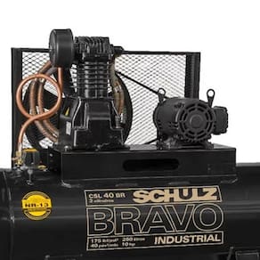 - Marca: Schulz - Modelo: BRAVO CSL 40BR/250 TR - Potência do motor 10 hp - Número de polos 2 - Volume do reservatório 261 L - Deslocamento Teórico (l/min) 1132 - Deslocamento Teórico (pcm) 40 - Pressão de operação máxima (bar) 12 - Pressão de operação máxima (lbf/pol²) 175 - Pressão de operação mínima (bar) 135 - Pressão de operação mínima (lbf/pol²) 9,3 - Unidade Compressora (n° de pistões) 2-L - Unidade Compressora (n° de estágios) 2 - Nível de Ruido (dB A) 92 - Altura: 63 cm - Largura: 1,58 cm - Comprimento: 1,16 cm - Peso Liquido (Kg): 3,16kg - Peso Bruto (Kg): 3,48kg