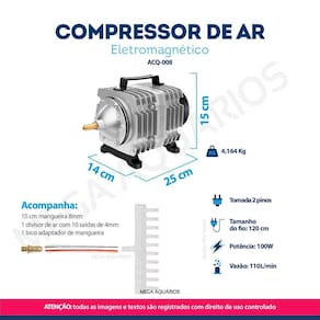 Compressor de ar eletromagnético oxigenador / aerador Boyu ACQ-008 110L/min para lago ou aplicação em indústria, acompanha divisor de ar de 10 saídas O compressor de ar Boyu ACO é fabricado em alumínio injetado, que garante a pressão sem perdas, é um equipamento indispensável para manter os níveis de oxigênio em lagos, além de inúmeras aplicações no setor industrial. O que você precisa saber antes de comprar: Características: Super potente Baixo consumo de energia Extremamente resistente Indicado para oxigenação de grande porte Não gera resíduos de óleo ou lubrificante no ar Ruído alto Motor eletromagnético linear Fluxo intenso e constante de ar Alumínio intejado Pode ficar ligado 24h por dia Saída de ar principal para mangueira de 8mm Acompanha divisor de ar de 10 saídas com saída de ar para mangueira de 4mm Tomada padrão 2 pinos Pés emborrachados evita o deslocamento e diminui o ruído decorrente da vibração do motor Auxilia na oxigenação da água e realiza a troca de gases tóxicos presente na água por meio do movimento gerado pelas bolhas de ar Precisa ficar protegido de sol e chuva Não possui controle de vazão Não acompanha mangueira de silicone de 4mm e pedras porosas Compre nesse anúncio diretamente com um revendedor oficial Sunsun no Brasil. Especificações técnicas: Marca: Boyu ou JAD enviada conforme disponibilidade Modelo: ACQ-008 Dimensões: 14 x 15 x 25 cm Potência: 100W Vazão: 110L/min Saídas de ar principal: 1 Divisor de ar com 10 saídas Pressão: 0.040mpa Tamanho do fio: 120cm Peso: 4,164 Kg Aplicação: Oxigenação de lagos e tanques de criação de peixes Oxigenação de baterias de aquários Enchimento de brinquedo infláveis Enchimento de colchão inflável Para Ferramenta de aplicação de pintura Bolhas de ar em paredes, balcões, tubos com água de festas eventos Hidroponia Máquina de gravação e corte de laser Cervejaria artesanal Envase de bebidas Indústria plástica, psicultura, gráfica, têxtil, química, agrícola e alimentícia. Conteúdo da embalagem: 1 compressor de ar 1 pedaço de mangueira de 8mm 1 divisor de ar com 10 saídas 1 bico adaptador de mangueira 1 manual de instruções Dicas de segurança: 1- Mantenha o compressor de ar sempre acima do nível da água, assim, caso acabe a energia, anula o risco de a água retornar pela mangueira de ar e posteriormente causar um curto-circuito no aparelho. 2- Não estique o fio da tomada completamente, ligue o equipamento sempre deixando uma folga formando uma espécie de barriga no fio, assim, caso escorra água pelo fio, ela não entrará em contato com a água. 3- Deixe em local seco, protegido do sol e chuva. Recomendações para uma maior durabilidade do compressor: Efetuar a limpeza dos acessórios a cada 15 dias Obrigado pela visita e boas compras Atenção Nossas imagens e textos são registrados e com direito de uso reservado a essa loja e as lojas parceiras devidamente autorizadas. Marca: Não Informado