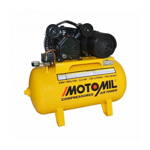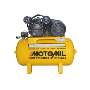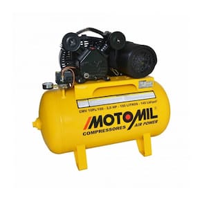 Especificações Técnicas: Modelo: CMV-10PL/100 - Motomil Air Power Tensão: 220/380V Motor elétrico: Trifásico 2 Polos Grau de Proteção: IP-21 Potência: 2CV = 1,5KW Deslocamento Teórico: 9,0 pés/min = 255L/min Pressão de operação (Mínimo): 100 lbf/pol - 6,9 bar Pressão de operação (Máximo): 140 lbf/ pol - 9,6 bar Número pistões - disposição: 2-V Número de estágios: 1 estagio Volume do vaso: 100L Rotação da unidade compressora: 1395 rpm Volume de óleo: 400 ml