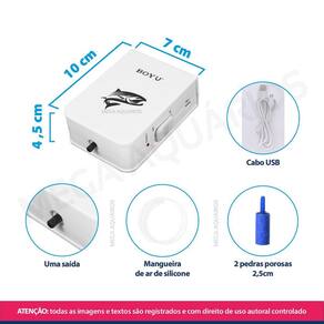 Especificações técnicas: Marca: Boyu Distribuidor: Mega Aquários Modelo: D-300 Voltagem: 110V / 220V - bivolt Potência: 0.4W Vazão: 1X 1,2L/min Saídas de ar: 2 Pressão: 0.01mpa Tamanho: 7 x 4,5 x 10 cm larg x alt x profundidade Peso: 194g Indicado para aquários de até: 50L