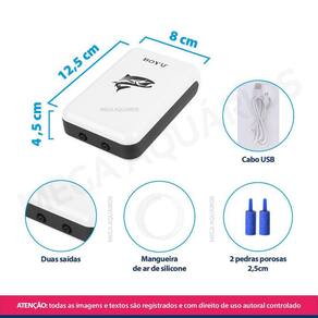Conteúdo da embalagem: 1 Compressor de ar D-600 1 Cabo USB/micro USB 2 Pedaços de 1m de mangueira de ar 4mm 2 Pedras porosas pequenas