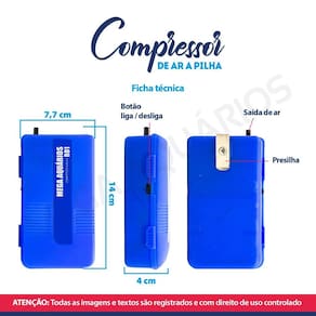 Características: Tempo de funcionamento: de 10 a 18h conforme qualidade da pilha Botão liga/desliga Acionamento manual Clip para prender no vidro do aquário ou em bolsa de transporte de iscas Uma saída de ar Auxilia na oxigenação da água Não estressa os peixes Baixo ruído Fácil manuseio Portátil Leve Seguro Item indispensável para aquaristas Realiza a troca de gases tóxicos presente na água por meio do fluxo de água / ar Acompanha mangueira de ar de 4mm + pedra porosa Não acompanha pilhas