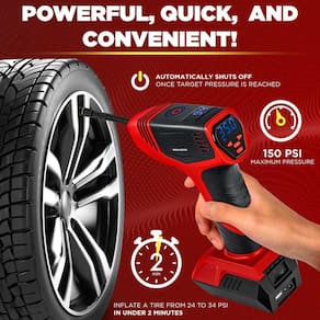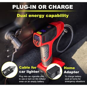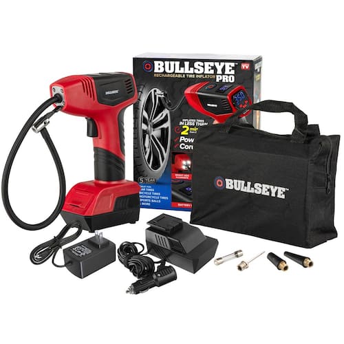 Bullseye Pro Max - Função pré-definida com desligamento automático – defina a tensão desejada e este inflador de pneu de carro desliga automaticamente quando o valor ou a pressão alvo do pneu é atingida. A tela LED fácil de ler exibe a pressão do pneu e o nível da bateria, e os botões de aumento/diminuição fáceis de usar tornam a calibração fácil e precisa. - Máximo de 150 PSI – infla rapidamente um pneu de 24 psi a 34 psi em menos de 2 minutos; o Bullseye Pro fornece 25 litros de ar por minuto para realizar o trabalho de forma rápida e segura - Recarregável e conveniente: vem com 2 carregadores diferentes - um carregador doméstico e um carregador de isqueiro para carro, oferecendo versatilidade e conveniência. O tamanho compacto com bolsa de armazenamento incluída facilita o armazenamento deste compressor de ar portátil - Fácil de usar mesmo na escuridão total: 4 luzes LED poderosas integradas na cabeça do dispositivo iluminam a área de trabalho e a tela de medidor de LED permite que você bombeie ar na escuridão total com precisão de ponto de pino para lhe dar paz de espírito onde quer que você vá, quando - Especificações: Dimensões do produto: A 26 x L 8 cm; Peso: 900 g. Unidades de medida: KPA, PSI, BAR, KG/CM; vem com 3 acessórios de bocal + 1 fusível sobressalente (15A); botão liga/desliga