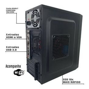 Computador Cpu Completo Intel Core I5 8GB SSD 480GB GeForce GT610 2GB com Teclado Mouse e Monitor de 24” Somos a Q7 Informática, uma empresa especializada em equipamentos de informática, referência por criar soluções completas com computadores. Ultrapasse limites e domine esse computador com desempenho rápido, responsivo e eficiente. Combina a potência dos poderosos processadores Intel com a velocidade da memória RAM de 8GB para maximizar a sua produtividade. Excelente computador para uso doméstico ou empresarial, com gabinete que cabe em qualquer espaço e com design moderno e muito bonito. Tecnologia com baixíssimo consumo de energia. Dê conta do trabalho: desenvolvido com processador Intel® Core™ i5 para ter um desempenho mais rápido.Lide com as cargas do trabalho com uso mais intensivo de recursos gráficos com a placa gráficas GeForce GT610 de 2GB. Aumente a produtividade diária com um silencioso conjunto de mouse e teclado de tamanho normal que oferece atalhos programáveis e teclas confortáveis. - Entrada HDMI de alta definição- Placa de Vídeo GeForce GT 610 2GB, experiência visual em alta definição • ESPECIFICAÇÕES TÉCNICAS ------| PROCESSADOR |------- Processador: Intel Core i5- Rede: 10/100/1000 Mbps ------| MEMÓRIA |------- Tamanho: 2X8GB- 2x slots DDR3- Arquitetura da memória: Dual Channel DDR3 ------| ARMAZENAMENTO |------- SSD: 480GB • CONEXÕES Frontal:- 2x PORTAS USB- 2 x portas de áudio (Alto falante / Microfone) Traseira:- 1x porta VGA- 1x porta HDMI- 4x portas USB 2.0- 1x porta RJ-45 de rede- Jacks de Áudio HD: Linha / Alto falante / Microfone ------| MONITOR |------- Monitor 24 polegadas ------| FONTE |------- Fonte REAL- 110/220V - BIVOLT- Acompanha cabo de força Acompanha Teclado e Mouse com fio USB Padrão ABNT2. Garantia de 6 meses contra defeitos de fabricação.
