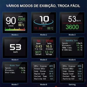 Funções do aparelho as informações são fornecidas pelo próprio automóvel : - medir a velocidade do automóvel; - medir rpm; - medir a temperatura da água; - medir a voltagem; - medir o consumo instantâneo do combustível; - medir a distância percorrida; - medir o tempo de viagem; - alarme de baixa voltagem; - alarme de temperatura elevada da água; - alarme de alta velocidade; - alarme de código de falha do motor; - eliminar o código de falha.