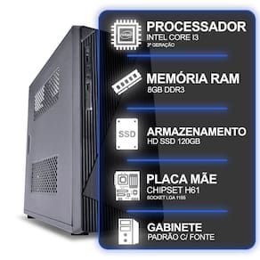 OBS: Imagem ilustrativa do produto, o modelo do Gabinete a ser enviado dependerá da disponibilidade no momento da montagem do computador, sempre respeitando o padrão de cor preto e boa qualidade do produto. Não acompanha Monitor, Teclado, Mouse ou Caixas de Som. Não acompanha Gravador de DVD.
