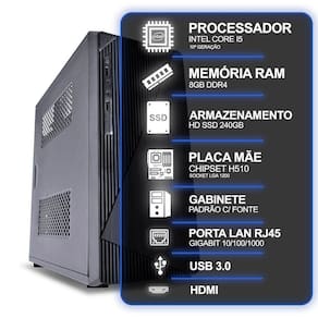 Obs: Imagem ilustrativa do produto, o modelo do gabinete a ser enviado dependerá da disponibilidade no momento da montagem do computador, sempre respeitando o padrão de cor preto e boa qualidade do produto. Não acompanha monitor, teclado, mouse ou caixas de som. Não acompanha gravador de dvd. Ean: 7792884238947