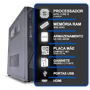 OBS: Imagem ilustrativa do produto, o modelo do Gabinete a ser enviado dependerá da disponibilidade no momento da montagem do computador, sempre respeitando o padrão de cor preto e boa qualidade do produto. Não acompanha Monitor, Teclado, Mouse ou Caixas de Som. Não acompanha Gravador de DVD.