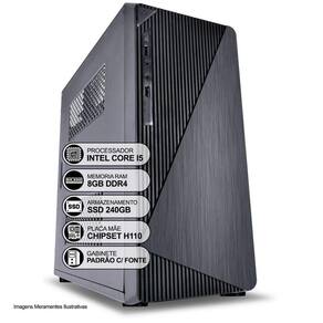 MARCA: COMPUTADOR DESKTOP INTELMODELO: GABINETE PRETO ATX | INTEL CORE I5 Equipamento com suporte e desempenho dentro do esperado para você realizar todas as atividades do seu dia à dia, com fluidez e eficiência em suas tarefas. Possui design moderno e compacto. Execute suas atividades de forma precisa e eficaz, com bom desempenho e baixo consumo de energia. Computador versátil, indicado para o seu entretenimento tais como vídeos, músicas e trabalho ou estudo. Indicado tanto para uso doméstico como uso corporativo. ESPECIFICAÇÕES: GABINETE:Cor: PretoFonte de Alimentação BivoltTipo: TorrePLACA-MÃE:Chipset H110Conexões USBHDMIVGAÁudioPorta LAN - RJ 45Conector SATA2x Slots de Memoria Ram DDR4Slot PCI-ExpressPROCESSADOR:Intel Core I5MEMORIA RAM:8GB DDR4HD/SSD: SSD 240GB SISTEMA OPERACIONAL:NÃO ACOMPANHA SISTEMA OPERACIONAL INSTALADO.COMPATÍVEL COM WINDOWS XP/7/10 E LINUXOBS: Imagem ilustrativa do produto, o modelo do Gabinete a ser enviado dependerá da disponibilidade no momento da montagem do computador, sempre respeitando o padrão de cor preto e boa qualidade do produto.Não acompanha Monitor, Teclado, Mouse ou Caixas de Som.Não acompanha Gravador de DVD.
