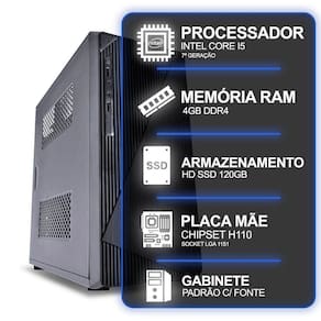Computador Desktop, Intel Core I5 7º Geração, 4Gb Ram, Hd Ssd 120Gb, Conexões Usb/Vga/Hdmi/Lan/Som Marca: computador desktop intelModelo: gabinete preto atx intel core i5 7 geração Equipamento com suporte e desempenho dentro do esperado para você realizar todas as atividades do seu dia à dia, com fluidez e eficiência em suas tarefas. Possui design moderno e compacto. Execute suas atividades de forma precisa e eficaz, com bom desempenho e baixo consumo de energia. Computador versátil, indicado para o seu entretenimento tais como vídeos, músicas e trabalho ou estudo. Indicado tanto para uso doméstico como uso corporativo. Especificações: Gabinete:Cor: preto Fonte de alimentação bivolt Tipo: torre Placa-mãe:Chipset h110 Conexões usb 2.0/3.0 Hdmi Vga Áudio Porta lan - rj 45Conector sata iii 2x slots de memoria ram ddr4 Processador:Intel core i5 7 geração Socket lga 1151 Placa de vídeo: Integrada Memoria ram:4gb ddr4 Hd/ssd: Ssd 120gb Sistema operacional:Não acompanha sistema operacional instalado.Compatível com windows xp/7/10 e linux Obs: Imagem ilustrativa do produto, o modelo do gabinete a ser enviado dependerá da disponibilidade no momento da montagem do computador, sempre respeitando o padrão de cor preto e boa qualidade do produto. Não acompanha monitor, teclado, mouse ou caixas de som. Não acompanha gravador de dvd.