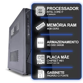 Computador Desktop, Intel Core I7 3º Geração, 4Gb Ram, Hd Ssd 240Gb, Conexões Usb/Vga/Hdmi/Lan/Som Marca: computador desktop intelModelo: gabinete preto atx intel core i7 3 geração Equipamento com suporte e desempenho dentro do esperado para você realizar todas as atividades do seu dia à dia, com fluidez e eficiência em suas tarefas. Possui design moderno e compacto. Execute suas atividades de forma precisa e eficaz, com bom desempenho e baixo consumo de energia. Computador versátil, indicado para o seu entretenimento tais como vídeos, músicas e trabalho ou estudo. Indicado tanto para uso doméstico como uso corporativo. Especificações: Gabinete:Cor: preto Fonte de alimentação bivolt Tipo: torre Placa-mãe:Chipset h61 Conexões usb Hdmi Vga Áudio Porta lan - rj 45 Conector sata 2x slots de memoria ram ddr3 Processador:Intel core i7 3 geração Socket lga 1155 Placa de vídeo: Integrada Memoria ram:4gb ddr3 Hd/ssd:Ssd 240gb Sistema operacional:Não acompanha sistema operacional instalado.Compatível com windows xp/7/10 e linux Obs: Imagem ilustrativa do produto, o modelo do gabinete a ser enviado dependerá da disponibilidade no momento da montagem do computador, sempre respeitando o padrão de cor preto e boa qualidade do produto. Não acompanha monitor, teclado, mouse ou caixas de som. Não acompanha gravador de dvd.
