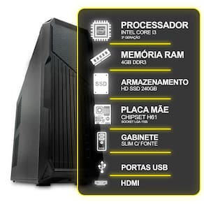 Computador Desktop Slim, Intel Core I3 3º Ger, 4GB RAM, HD SSD 240GB, Conexões USB/VGA/HDMI/LAN/SOM