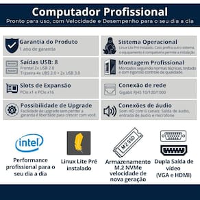 Computador I7 13 Geração 32gb M.2 512gb Vga 2gb 500w Computador com desempenho, preço justo e suporte de verdade - são mais de 30 anos de experiência em tecnologia, garantindo confiança e qualidade para você Equipamentos prontos para usar no dia a dia, com peças de qualidade, sistema instalado e de quem sabe o que faz. Ideal para quem busca um computador ágil e confiável, essa máquina foi pensada para lidar com várias tarefas ao mesmo tempo, sem travamentos ou perda de desempenho. Nossos diferenciais: 1. Montagem nacional com padrão Todos os nossos computadores são montados em ambiente industrial dentro do Brasil, seguindo normas técnicas e rigoroso controle de qualidade. Isso garante um equipamento confiável, com suporte direto e entrega mais rápida. 2 . Linux Lite Pré-instalado O computador já acompanha o sistema operacional Linux Lite instalado, pronto para uso. É uma opção leve, estável e funcional, ideal para as tarefas do dia a dia. Caso prefira outro sistema operacional, o equipamento é totalmente compatível e permite a instalação de outras versões, como Windows ou outras distribuições Linux, conforme sua preferência. 3. Armazenamento M.2 NVMe: velocidade de nova geração Este computador já vem com armazenamento no formato M.2 NVMe, que é ainda mais rápido do que os SSDs tradicionais. Essa tecnologia permite inicialização quase instantânea do sistema e abertura de programas em segundos, oferecendo uma experiência mais fluida e produtiva no uso diário. 4. Desempenho com Processador Intel Equipado com processador Intel, reconhecido mundialmente por sua estabilidade e eficiência, esse computador oferece excelente desempenho para uso diário, multitarefas e aplicações profissionais. Você verá as especificações completas do processador mais abaixo na descrição. 5. Expansível e pronto para upgrades - sem perder a Quer adicionar uma placa de vídeo dedicada Ou instalar mais memória ou um novo HD Espaço interno e conexões disponíveis para você expandir quando quiser. Instale mais memória, HD ou placa de vídeo sem afetar a de fábrica. 6. de fábrica e suporte ao cliente Produto testado, revisado e enviado pronto para uso. Conta com completa e suporte técnico direto com a gente. . Em caso de dúvidas, estamos prontos para atender você com agilidade e clareza, garantindo uma experiência pós-venda segura e confiável. Especificações técnicas: Processador Marca: Intel Série: I7-13700F 13 Geração Frequência base: 2.10 Ghz Frequência Turbo Max: 5.20ghz Núcleos: 16 Threads: 24 Placa-mãe Modelo: H610 Chipset Intel Socket: LGA 1700 - Suporte para Intel 12 e 13 geração Formato: Micro ATX Memória: 2 slots DDR4 - até 64GB Vídeo: HDMI + VGA Slots de expansão: 1x PCI Express x16, 2x PCI Express x1 Armazenamento: 4x SATA III + 1x M.2 NVMe Usb traseiras: 2x USB 3.2 + 4x USB 2.0 Rede: Gigabit LAN 10/100/1000 Áudio: HD integrado line in/out + mic Outros: Conectores para fan, áudio frontal e USB Memória RAM Capacidade: 32GB Armazenamento Tipo: M.2 Capacidade: 512GB Placa de vídeo Capacidade: 2GB Gabinete Placa mãe suportada: Micro ATX Conexões: 2x USB e 2x áudio Cor: Preto Baias: Não possui Fonte Voltagem: bivolt Potência: 500W Sistema Operacional Linux Lite Observações: As imagens são meramente ilustrativas. Eventuais variações no design não comprometem o desempenho ou a compatibilidade do produto.